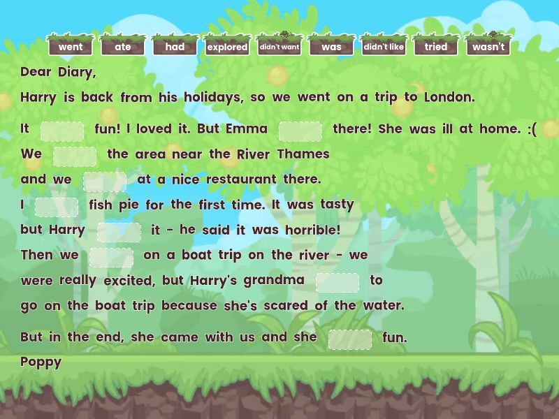 Dear Diary, Harry is back from his holidays, so we went on a trip to London. It ____ fun! I loved it. But Emma ____ there! She was ill at home. :( We ____ the area near the River Thames and we ____ at a nice restaurant there. I ____ fish pie for the first time. It was tasty but Harry ____ it - he said it was horrible! Then we ____ on a boat trip on the river - we were really excited, but Harry's grandma ____ to go on the boat trip because she's scared of the water. But in the end, she came with us and she ____ fun. Poppy