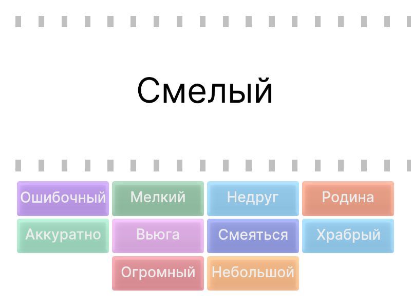 Храбрый - Смелый, Огромный - Гигантский, Небольшой - Маленький, Мелкий - Крохотный, Вьюга - Метель, Смеяться - Хохотать, Аккуратно - Опрятно, Родина - Отечество, Ошибочный - Неудачный, Недруг - Враг,