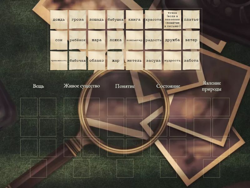 Вещь: книга, ложка, компьютер, платье, Живое существо: бабочка, ребёнок, лошадь, бабушка, Понятие: дружба, красота, мудрость, точка (если в значении «понятие в письме»), забота, тревожность, радость, Состояние: сон, жар, засуха , Явление природы: гроза , метель , дождь , ветер, жара, облако ,