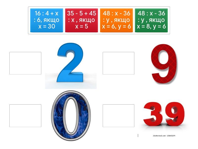 48 : х - 36 : у , якщо х = 8, у = 6, 48 : х - 36 : у , якщо х = 6, у = 6  , 35 - 5 + 45 : х , якщо х = 5, 16 : 4 + х : 6, якщо х = 30,