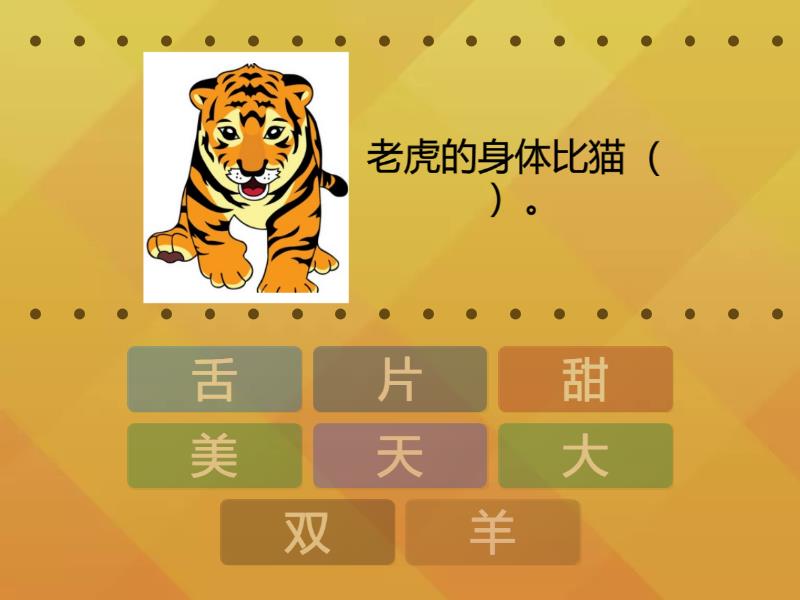 大 - 老虎的身体比猫( )。, 天 - ( )黑了,星星出来了。, 甜 - 我喜欢吃香( )的西瓜。, 舌 - 弟弟对着镜子伸( )头。, 双 - 妈妈送我一( )运动鞋。, 片 - 这( )草地是我们游戏的场所。, 羊 - 家明画了一只( )。, 美 - 妹妹有一双( )丽的大眼睛。,