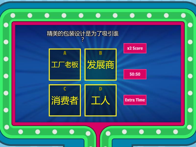1) 精美的包装设计是为了吸引谁 ? a) 工厂老板 b) 发展商 c) 消费者 d) 工人 2) 在销售的功能里, _____是很重要的 . a) 包装的价格 b) 包装的大小 c) 包装的成分 d) 包装的设计 3) 哪一项不是包装的重要性 ? a) 保护产品的外形 b) 保证产品的价格 c) 促销产品 d) 提供产品信息 4) 哪项是非食品的包装? a) b) c) d) 5) 哪项是食品的包装? a) b) c) d)