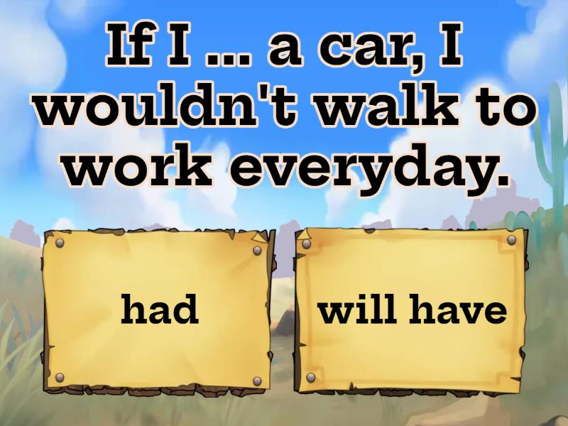 1) If I ... a car, I wouldn't walk to work everyday. a) had b) will have 2) If I won the lottery, I ... a Ferrari. a) buy b) would buy 3) If I ... you, I would go to the doctor immediately. a) were b) will be 4) What would you do if you... a wallet in the street? a) found b) find 5) I ... forgive Sophie if I were you. a) wouldn't b) won't 6) ... you go to Brenda's party if you weren't busy? a) Would b) Will 7) If I were you, I ... Kevin the truth. a) will tell b) would tell 8) What would you do if you … a snake? a) see b) saw c) did see 9) If I ... time, I would help you. a) have b) had c) will have 10) If I were you, I ... this hat. It's nice. a) buy b) bought c) would buy 11) What ... you do if you won the lottery? a) would b) will c) did 12) What would you do if you... a motorbike for your birthday? a) get b) got c) will get