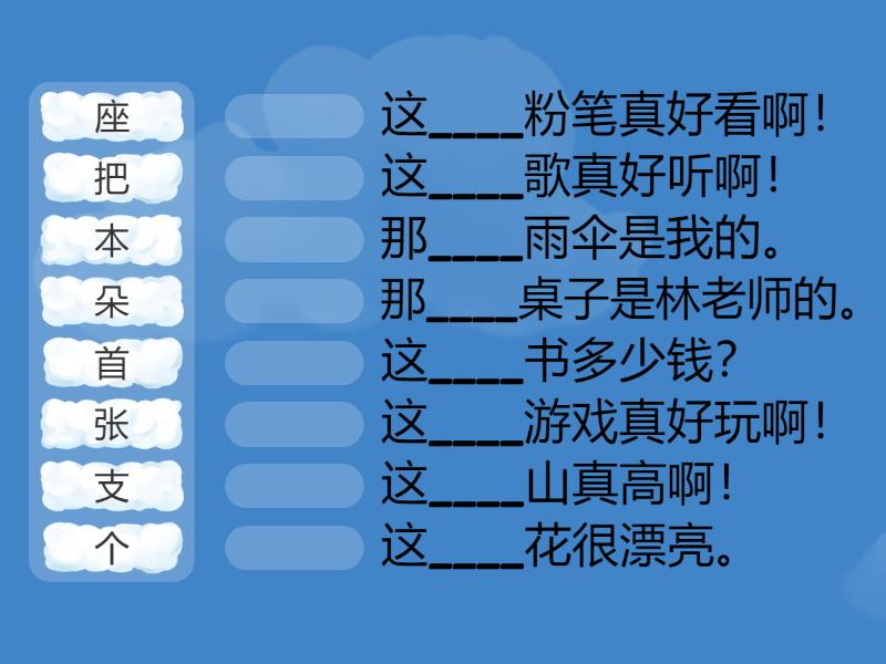 朵 - 这____花很漂亮。, 座 - 这____山真高啊!, 个 - 这____游戏真好玩啊!, 首 - 这____歌真好听啊!, 支 - 这____粉笔真好看啊!, 本 - 这____书多少钱?, 把 - 那____雨伞是我的。, 张 - 那____桌子是林老师的。,