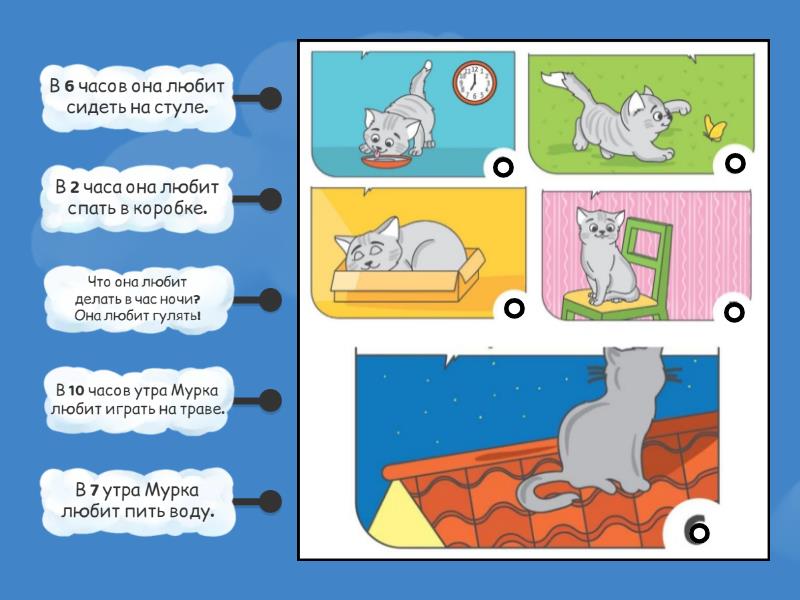 В 7 утра Мурка любит пить воду., В 10 часов утра Мурка любит играть на траве., В 2 часа она любит спать в коробке., В 6 часов она любит сидеть на стуле., Что она любит делать в час ночи? Она любит гулять!.
