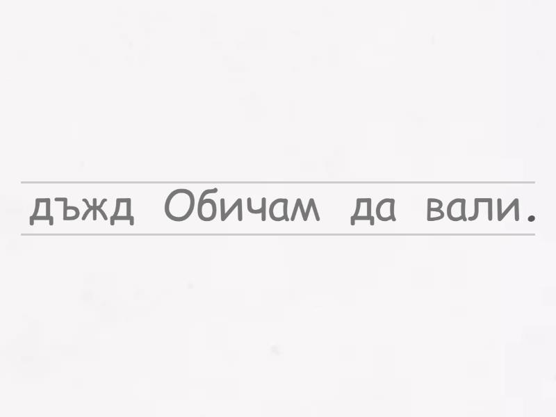 Обичам да ходя на лекар., Не обичам да ходя на море., Обичам горещо лято., Обичам да вали дъжд., Не обичам да е слънчево., Не харесвам ваканциите., Не обичам да е зима.,