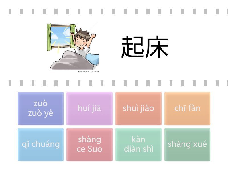 qǐ chuáng - 起床, shàng ce Suo - 上厕所, chī fàn - 吃饭, shàng xué - 上学, huí jiā - 回家, zuò zuò yè - 做作业, kàn diàn shì - 看电视, shuì jiào - 睡觉,
