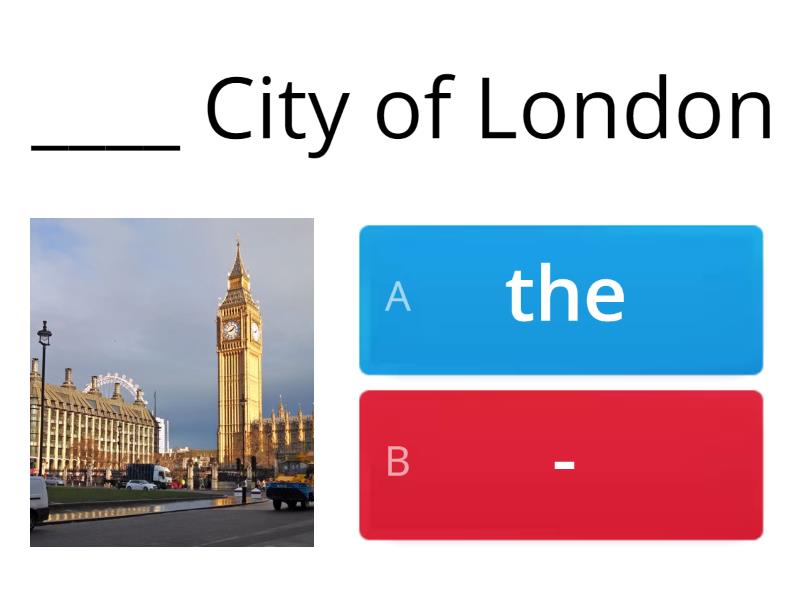 1) ____ City of London a) the b) - 2) ____ Port of London a) the b) - 3) ____ British Museum a) the b) - 4) ____ Odeon cinema a) the b) - 5) ____ Oxford Street a) the b) _ 6) ___ National Gallery a) the b) - 7) ___ St. Paul´s Cathedral a) the b) - 8) ____ London Bridge a) the b) - 9) ____ Westminster Abbey a) the b) - 10) ____ Tower of London a) the b) - 11) ___ Regent´s Park a) the b) - 12) ___ Buckingham Palace a) the b) -