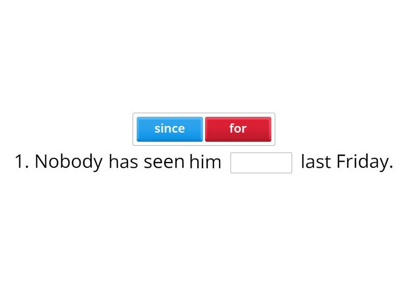 1. Nobody has seen him ____ last Friday. It has been rainy ____ the last 5 days. He has lived in France ____ eight years. We've had terrible weather ____ Saturday. He hasn't been to school ____ a week. Things have changed ____ he became the head of the company. I've known Maria ____ 1990. The police has looked for him ____ a month! Our dog has been ill ____ two days. She hasn't lost a match ____ April. He's changed to much ____ he got married. We've run this business ____ ages.