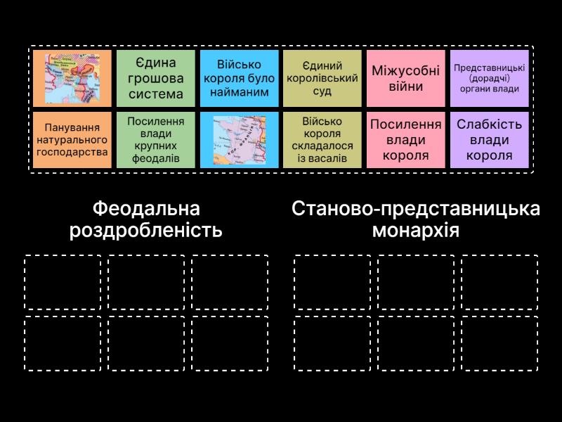 Феодальна роздробленість: Посилення влади крупних феодалів, Панування натурального господарства, Міжусобні війни, Слабкість влади короля, Військо короля складалося із васалів, , Станово-представницька монархія: Представницькі (дорадчі) органи влади, Посилення влади короля, Військо короля було найманим, Єдина грошова система, Єдиний королівський суд, ,