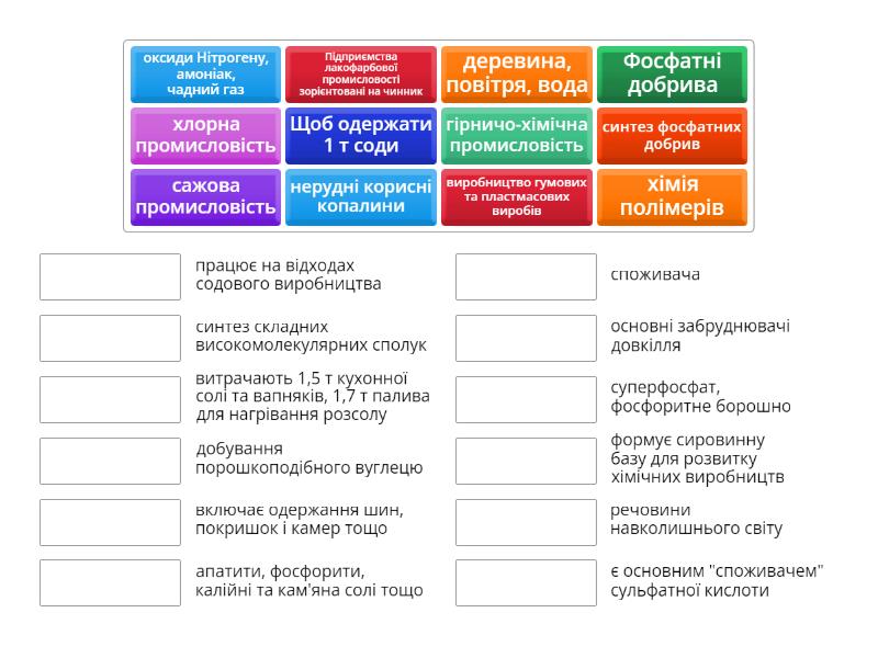 гірничо-хімічна промисловість - формує сировинну базу для розвитку хімічних виробництв, виробництво гумових та пластмасових виробів - включає одержання шин, покришок і камер тощо, нерудні корисні копалини - апатити, фосфорити, калійні та кам'яна солі тощо, деревина, повітря, вода - речовини навколишнього світу, Щоб одержати 1 т соди - витрачають 1,5 т кухонної солі та вапняків, 1,7 т палива для нагрівання розсолу, хлорна промисловість - працює на відходах содового виробництва, синтез фосфатних добрив - є основним "споживачем" сульфатної кислоти, сажова промисловість - добування порошкоподібного вуглецю, хімія полімерів - синтез складних високомолекулярних сполук, Підприємства лакофарбової промисловості зорієнтовані на чинник - споживача, оксиди Нітрогену, амоніак, чадний газ - основні забруднювачі довкілля, Фосфатні добрива - суперфосфат, фосфоритне борошно,