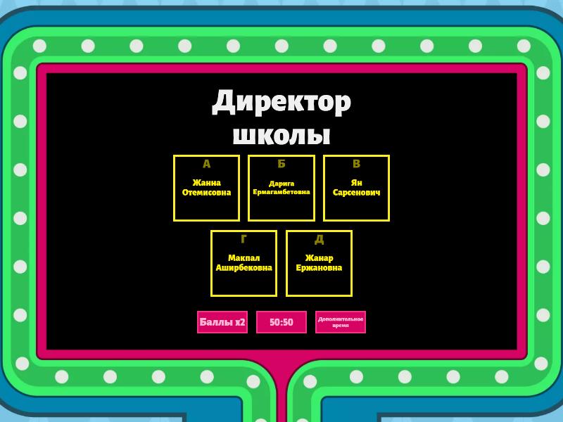 1) Директор школы a) Жанна Отемисовна b) Дарига Ермагамбетовна c) Ян Сарсенович d) Макпал Аширбековна e) Жанар Ержановна 2) Чье имя носит школа? a) Иван Иванович b) Владимир Дмитриевич c) Дмитрий Иванович d) Иван Дмитриевич e) Лев Николаевич 3) Сколько этажей в школе a) 1 b) 2 c) 3 d) 4 e) 5 4) Сколько смен a) 1 b) 2 c) 3 d) 4 e) 5 5) Какие профильные предметы a) физика,химия b) биология c) математика, физика, химия d) химия ,биология, математика e) химия,биология 6) Сколько предметов у вас в расписании a) 20 b) 22 c) 24 d) 25 e) 26 7) Сколько завучей у вас в школе a) 3 b) 4 c) 7 d) 6 e) 5 8) Когда наша школа получила статус лицей a) октябрь 1990 b) ноябрь 1998 c) октябрь 1994 d) декабрь 2000 e) ноябрь 2002 9) Сколько учителей математики у вас в школе a) 10 b) 15 c) 13 d) 14 e) 12