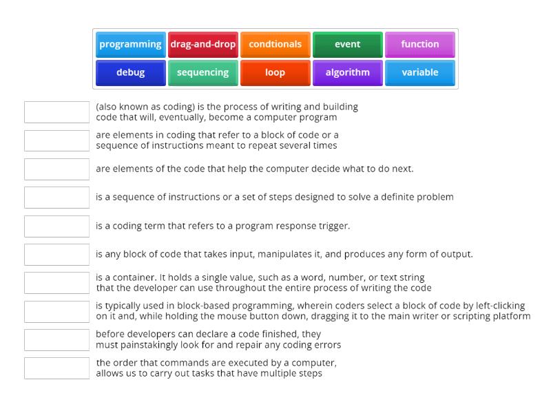 loop - are elements in coding that refer to a block of code or a sequence of instructions meant to repeat several times, condtionals - are elements of the code that help the computer decide what to do next., debug - before developers can declare a code finished, they must painstakingly look for and repair any coding errors, variable - is a container. It holds a single value, such as a word, number, or text string that the developer can use throughout the entire process of writing the code, sequencing - the order that commands are executed by a computer, allows us to carry out tasks that have multiple steps, event - is a coding term that refers to a program response trigger., function - is any block of code that takes input, manipulates it, and produces any form of output., algorithm - is a sequence of instructions or a set of steps designed to solve a definite problem, drag-and-drop - is typically used in block-based programming, wherein coders select a block of code by left-clicking on it and, while holding the mouse button down, dragging it to the main writer or scripting platform, programming - (also known as coding) is the process of writing and building code that will, eventually, become a computer program,