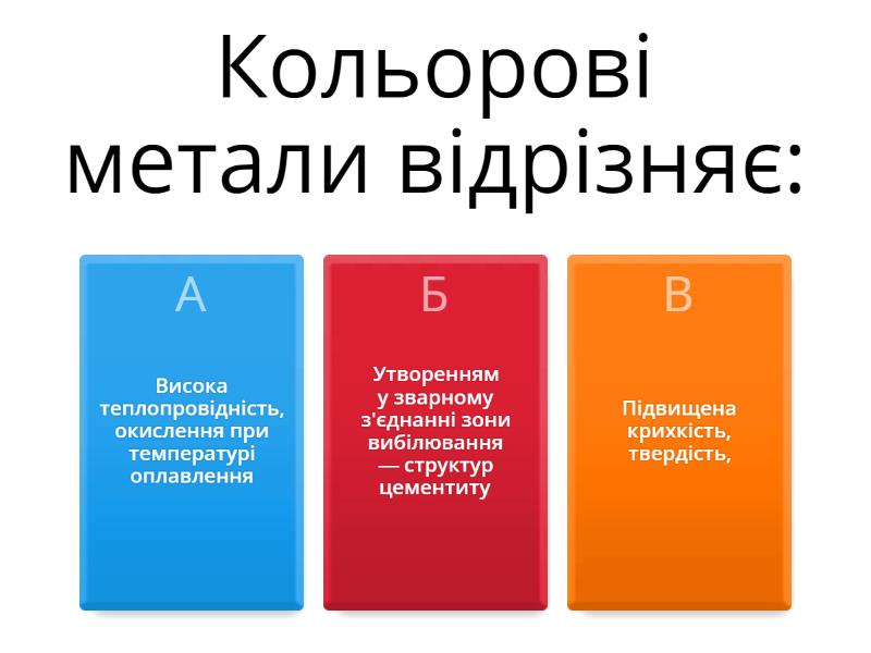 1) Кольорові метали відрізняє: a) Висока теплопровідність, окислення при температурі оплавлення b) Утворенням у зварному з'єднанні зони вибілювання — структур цементиту c) Підвищена крихкість, твердість, 2) Кольорові метали можна умовно розділити на такі групи: a) Важкі, неактивні, крихкі b) Легкі, активні і тугоплавкі, дорогоцінні c) Інертні, легкі, важкотекучі 3) Однією з характерних особливостей більшості кольорових металів є: a) висока хімічна активність, спорідненість до газів повітря і схильність до окислення b) низька хімічна активність, неможливість розтворятися у воді c) крихкість, висока температура плавлення 4) Одним з характерних дефектів при зварюванні кольорових металів є: a) інертність b) крихкість c) пористість 5) Де знаходять застосування кольорові метали? a) літакобудування b) приборобудування c) суднобудування d) всі відповіді вірні