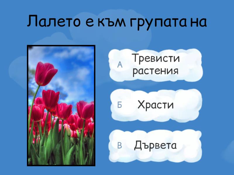 1) Лалето е към групата на a) Тревисти растения b) Храсти c) Дървета 2) Малината е към групата на a) Тревисти растения b) Храсти c) Дървета 3) Слънчогледът е към групата на a) Тревисти растения b) Храсти c) Дървета 4) Глогът е към групата на a) Тревисти растения b) Храсти c) Дървета 5) Дъбът е към групата на a) Тревисти растения b) Храсти c) Дървета 6) Кестенът е към групата на a) Тревисти растения b) Храсти c) Дървета 7) Клекът е към групата на a) Тревисти растения b) Храсти c) Дървета 8) Люлякът е към групата на a) Тревисти растения b) Храсти c) Дървета 9) Макът е към групата на a) Тревисти растения b) Храсти c) Дървета 10) Смърчът е към групата на a) Тревисти растения b) Храсти c) Дървета 11) Царевицата е към групата на a) Тревисти растения  b) Храсти c) Дървета 12) Черешата е към групата на a) Тревисти растения b) Храсти c) Дървета
