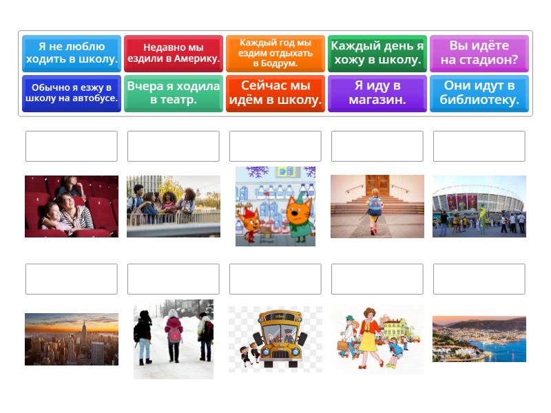 Каждый день я хожу в школу., Я не люблю ходить в школу., Сейчас мы идём в школу., Обычно я езжу в школу на автобусе., Вчера я ходила в театр., Каждый год мы ездим отдыхать в Бодрум., Я иду в магазин., Вы идёте на стадион?, Они идут в библиотеку., Недавно мы ездили в Америку.,