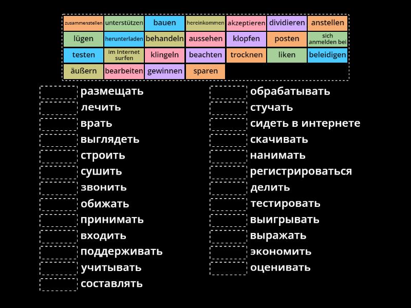 beachten - учитывать , hereinkommen - входить , dividieren - делить , gewinnen - выигрывать , behandeln - лечить , sparen - экономить , posten - размещать , bearbeiten - обрабатывать , aussehen - выглядеть , akzeptieren - принимать , liken - оценивать , äußern - выражать , sich anmelden bei - регистрироваться , klopfen - стучать , zusammenstellen - составлять , herunterladen - скачивать , testen - тестировать , trocknen - сушить , im Internet surfen - сидеть в интернете , beleidigen - обижать , unterstützen - поддерживать , klingeln - звонить , bauen - строить , lügen - врать , anstellen - нанимать,