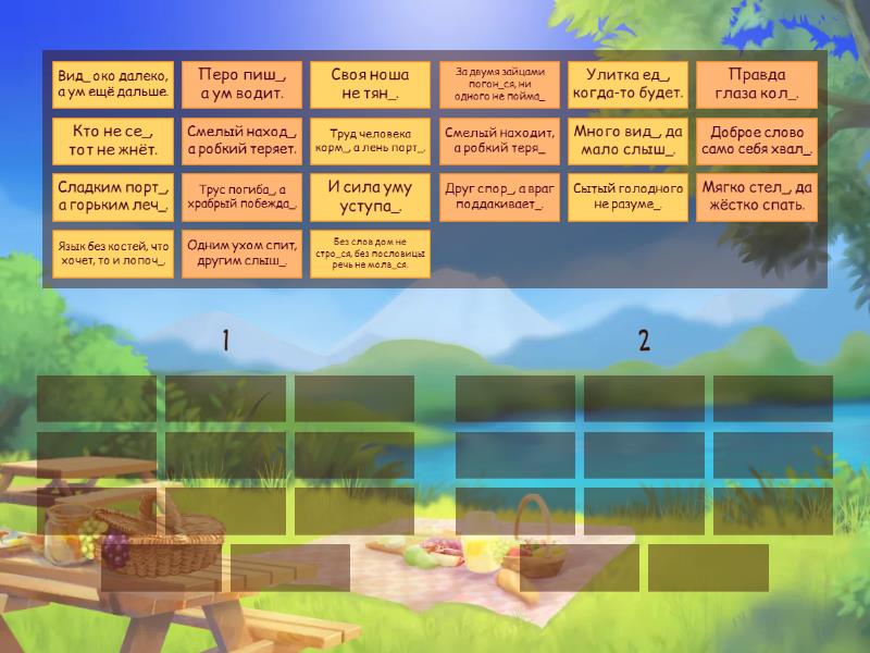 1: Правда глаза кол_. , Своя ноша не тян_. , Кто не се_, тот не жнёт. , Улитка ед_, когда-то будет. , Сытый голодного не разуме_. , И сила уму уступа_. , Смелый находит, а робкий теря_ , Язык без костей, что хочет, то и лопоч_. , Мягко стел_, да жёстко спать. , Перо пиш_, а ум водит. , Трус погиба_, а храбрый побежда_., 2: Без слов дом не стро_ся, без пословицы речь не молв_ся. , Доброе слово само себя хвал_. , Труд человека корм_, а лень порт_. , Вид_ око далеко, а ум ещё дальше. , Смелый наход_, а робкий теряет., За двумя зайцами погон_ся, ни одного не пойма_ , Много вид_, да мало слыш_. , Одним ухом спит, другим слыш_. , Друг спор_, а враг поддакивает_. , Сладким порт_, а горьким леч_. ,