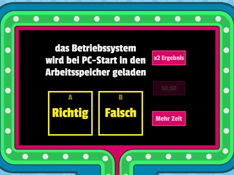 1) Arbeitsspeicher ist größer als Festplattenspeicher a) Richtig b) Falsch 2) das Betriebssystem wird bei PC-Start in den Arbeitsspeicher geladen a) Richtig b) Falsch 3) je größer der Arbeitsspeicher desto schlechter lassen sich Programme ausführen a) Richtig b) Falsch 4) Arbeitsspeicher befindet sich auf sogenannten RAM-Riegeln und kann häufig am PC nachgerüstet werden a) Richtig b) Falsch 5) Daten werden im Arbeitsspeicher dauerhaft gespeichert a) Richtig b) Falsch 6) damit Spiele am PC optimal gespielt werden können, sollten sie auf dem Arbeitsspeicher installiert werden a) Richtig b) Falsch 7) sobald die Stromzufuhr des PCs unterbrochen wird, gehen alle Daten im Arbeitsspeicher verloren a) Richtig b) Falsch 8) Was ist keine alternative Bezeichnung für Arbeitsspeicher? a) Festplatte b) RAM c) Hauptspeicher d) Primär-Speicher 9) Arbeitsspeicher ist langsamer als Festplattenspeicher a) Richtig b) Falsch 10) RAM steht für: a) Random Access Mainboard b) Random Access Memory c) Reales Arbeitsspeicher Medium d) Real Access Memory