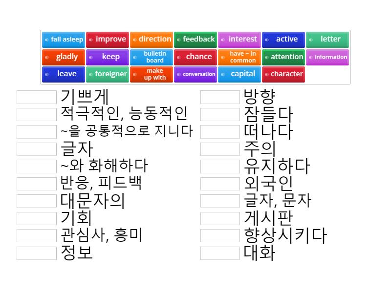 active - 적극적인, 능동적인, attention - 주의, bulletin board - 게시판, capital - 대문자의, chance - 기회, character - 글자, conversation - 대화, direction - 방향, fall asleep - 잠들다, feedback - 반응, 피드백, foreigner - 외국인, gladly - 기쁘게, have ~ in common - ~을 공통적으로 지니다, improve - 향상시키다, information - 정보, interest - 관심사, 흥미, keep - 유지하다, leave - 떠나다, letter - 글자, 문자, make up with - ~와 화해하다,