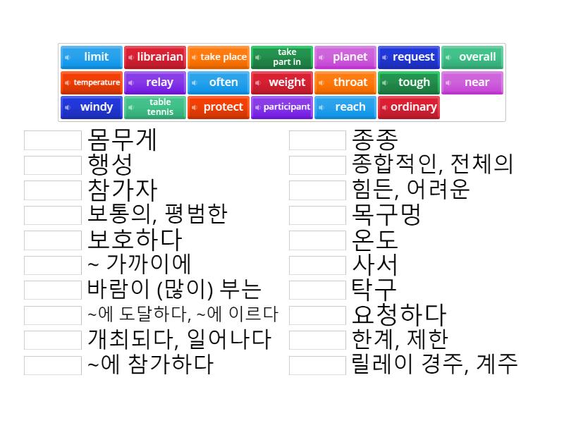 librarian - 사서, limit - 한계, 제한, near - ~ 가까이에, often - 종종, ordinary - 보통의, 평범한, overall - 종합적인, 전체의, participant - 참가자, planet - 행성, protect - 보호하다, reach - ~에 도달하다, ~에 이르다, relay - 릴레이 경주, 계주, request - 요청하다, table tennis - 탁구, take part in - ~에 참가하다, take place - 개최되다, 일어나다, temperature - 온도, throat - 목구멍, tough - 힘든, 어려운, weight - 몸무게, windy - 바람이 (많이) 부는,