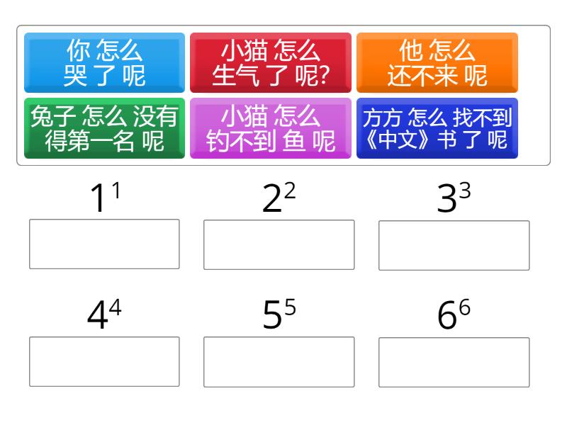 方方 怎么 找不到 《中文》书 了 呢, 他 怎么 还不来 呢, 你 怎么 哭 了 呢, 小猫 怎么 钓不到 鱼 呢, 小猫 怎么 生气 了 呢?, 兔子 怎么 没有 得第一名 呢.