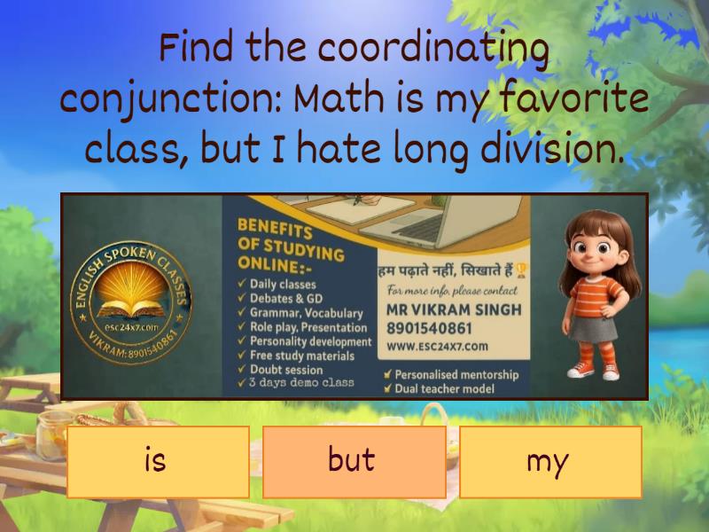 1) Find the coordinating conjunction: Math is my favorite class, but I hate long division. a) is b) but c) my 2) Find the coordinating conjunction: I am not a fan of action movies nor of horror movies a) nor b) am c) not 3) Find the coordinating conjunction: Would you like soup or salad with your entree? a) or b) your c) would d) with 4) Find the coordinating conjunction: Trevor took out the trash and wiped the counters. a) took b) the c) and 5) Find the coordinating conjunction: I studied every day this week, yet I did poorly on the test. a) on b) did c) yet 6) Find the coordinating conjunction: He had to clean the house, for his parents were coming home. a) for b) were c) had 7) Find the coordinating conjunction: Mansi is a vegetarian, so we should skip the non veg restaurant. a) skip b) so c) should 8) Find the coordiating conjunction: I can't give you any money, but I can give you a high-five. a) but b) give c) can 9) Find the coordinating conjunction(s): She is crying, but I just fed her and changed her diaper. a) but, and b) is, but c) is, and 10) Find the coordinating conjunction: Make the most of yourself, for that is all there is of you. a) there b) of c) for