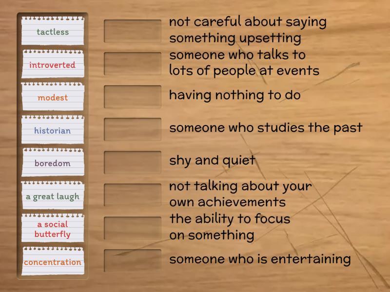 boredom - having nothing to do, modest - not talking about your own achievements, concentration - the ability to focus on something, a social butterfly - someone who talks to lots of people at events, tactless - not careful about saying something upsetting, introverted - shy and quiet, a great laugh - someone who is entertaining, historian - someone who studies the past,