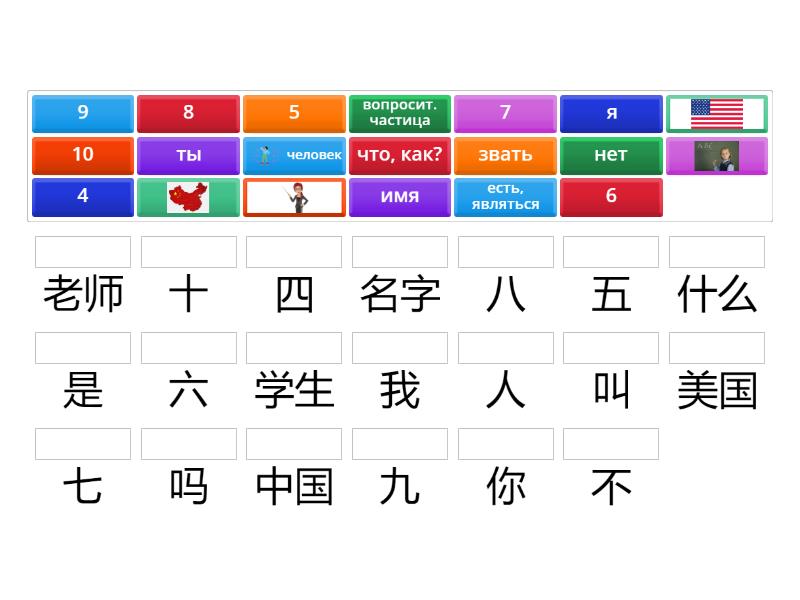 звать - 叫 , что, как? - 什么, имя - 名字, я - 我, есть, являться - 是, 老师, ты - 你, 学生, вопросит. частица - 吗, нет - 不, 中国, 美国, человек - 人, 4 - 四, 5 - 五, 6 - 六, 7 - 七, 8 - 八, 9 - 九, 10 - 十,