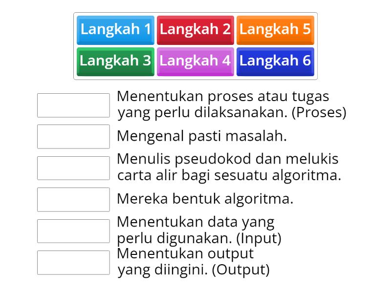 Langkah 1 - Mengenal pasti masalah., Langkah 2 - Menentukan data yang perlu digunakan. (Input), Langkah 3 - Menentukan proses atau tugas yang perlu dilaksanakan. (Proses), Langkah 4 - Menentukan output yang diingini. (Output), Langkah 5 - Mereka bentuk algoritma., Langkah 6 - Menulis pseudokod dan melukis carta alir bagi sesuatu algoritma.,