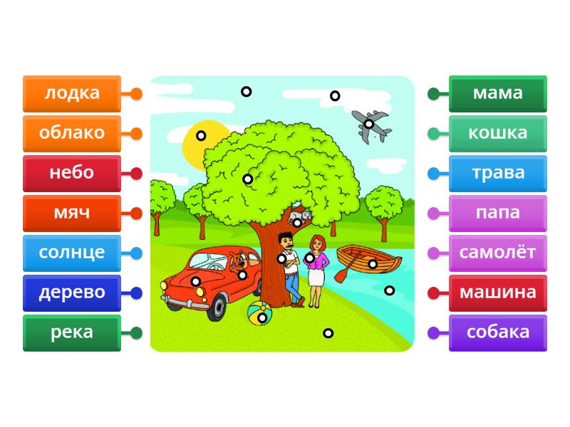 солнце, машина, лодка, река, самолёт, дерево, кошка, мяч, собака, трава, небо, облако, мама, папа.