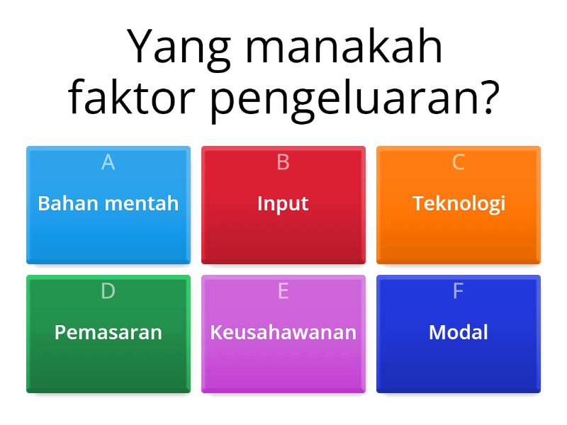 1) Yang manakah faktor pengeluaran? a) Bahan mentah b) Input c) Teknologi d) Pemasaran e) Keusahawanan f) Modal 2) Yang manakah tersenarai dalam Matriks BCG? a) Anjing b) Kucing c) Bulan d) Bintang 3) Dua kelebihan kaedah pemeriksaan menyeluruh. a) Setiap produk akan diperiksa untuk memastikan hanya yang sempurna dihantar kepada pelanggan. b) Menjimatkan masa dalam pemeriksaan. c) Dapat mengurangkan kadar produk yang dipulangkan dan menaikkan reputasi organisasi. 4) Dua sistem kawalan inventori. a) Sistem kawalan inventori selanjar. b) Sistem kawalan inventori berkumpulan. c) Sistem kawalan inventori berkala. 5) Saluran agihan produk. a) Pengeluar -> pemborong b) Pengeluar -> pengguna c) Pengeluar -> pemborong -> peruncit -> pengguna d) Pengeluar -> peruncit 6) Yang manakah dalam senarai persekitaran tugas. a) Persekitaran ekonomi. b) Pelanggan c) Persekitaran sosiobudaya. d) Persekitaran teknologi. e) Kerajaan. f) Masyarakat. 7) Faktor pemilihan lokasi kilang. a) Bekalan tenaga buruh. b) Faktor persekitaran c) Peningkatan teknologi. d) Penekanan kepada kualiti. 8) Pihak ini merupakan pihak yang menyumbang modal ke dalam perniagaan dan mengharapkan pulangan yang baik daripada hasil pelaburan modal yang dikeluarkan. Siapakah pihak tersebut? a) Pembiaya. b) Pembekal. c) Pelabur. d) Pesaing. 9) Apakah maksud pengurus kewangan? a) Nilai pertukaran dalam bentuk wang bagi sesuatu produk atau perkhidmatan yang dipersetujui oleh penjual dan pembeli dalam suatu urus niaga. b) Aktiviti melibatkan perancangan, penyusunan dan pengawalan keatas segala aspek kewangan dengan cekap dan berkesan. 10) ‘Merujuk kepada persetujuan bersama antara peserta takaful dengan pengendali takaful yang mengikat satu perjanjian dalam menjalankan peranan masing-masing.’ Perkara tersebut merujuk kepada prinsip takaful: a) Gharar b) Maisir c) Riba’ d) Akad e) Jual beli