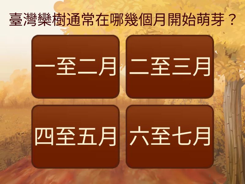 1) 臺灣欒樹通常在哪幾個月開始萌芽? a) 一至二月 b) 二至三月 c) 四至五月 d) 六至七月 2) 臺灣欒樹的花是什麼顏色? a) 粉紅色 b) 藍色 c) 黃色 d) 白色 3) 臺灣欒樹的果實最初呈現什麼顏色? a) 褐紅色 b) 黃色 c) 粉紅色 d) 綠色 4) 臺灣欒樹的葉子在冬天會怎樣? a) 增加 b) 變色 c) 掉落 d) 變小 5) 臺灣欒樹的根系有什麼作用? a) 提供食物 b) 美化環境 c) 穩定邊坡 d) 吸收水分 6) 每年哪幾個月臺灣會有颱風和大雨? a) 一至三月 b) 四至六月 c) 七至九月 d) 十月至十二月 7) 當臺灣欒樹結滿果實時,這代表什麼? a) 春天來了 b) 颱風季節已過 c) 夏天來了 d) 冬天來了 8) 鳥兒為什麼喜歡臺灣欒樹? a) 樹很高 b) 樹葉很好看 c) 樹上的果實是它們的食物 d) 樹可以避雨 9) 臺灣欒樹的種子有什麼特別的形狀? a) 圓形 b) 方形 c) 像翅膀的形狀 d) 三角形 10) 臺灣欒樹的種子為什麼不容易受傷? a) 有很強的外殼 b) 有薄膜的緩衝 c) 能夠飛 d) 會自己藏起來 11) 臺灣欒樹的果實是如何形成的? a) 由根部長出 b) 由花變成的 c) 由樹幹產生 d) 由土壤中的水分轉變 12) 哪一種天氣會使臺灣欒樹不開花、不結果? a) 暴風雪 b) 大雨和颱風 c) 晴天 d) 秋天的風 13) 臺灣欒樹的根系有助於什麼? a) 提供養分 b) 養活小動物 c) 保持土壤穩定 d) 增加水分 14) 臺灣欒樹在春天的時候會怎樣? a) 開花結果 b) 落葉 c) 長出新芽 d) 停止生長 15) 為什麼臺灣欒樹對環境很重要? a) 可以當作家具 b) 能夠吸收污染 c) 提供食物和穩定土壤 d) 會長得很高
