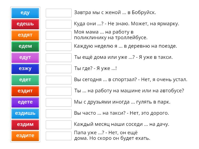 еду - Ты где? - Я уже ...!, езжу - Каждую неделю я ... в деревню на поезде., едешь - Ты ещё дома или уже ...? - Я уже в такси., ездишь - Ты ... на работу на машине или на автобусе?, едете - Вы сегодня ... в спортзал? - Нет, я очень устал. , ездите - Вы часто ... на такси? - Нет, это дорого., едем - Завтра мы с женой ... в Бобруйск., ездим - Мы с друзьями иногда ... гулять в парк., едет - Папа уже ...? - Нет, он ещё дома. Но скоро он будет ехать., ездит - Моя мама ... на работу в поликлинику на троллейбусе., едут - Куда они ...? - Не знаю. Может, на ярмарку., ездят - Каждый месяц наши соседи ... на дачу.,