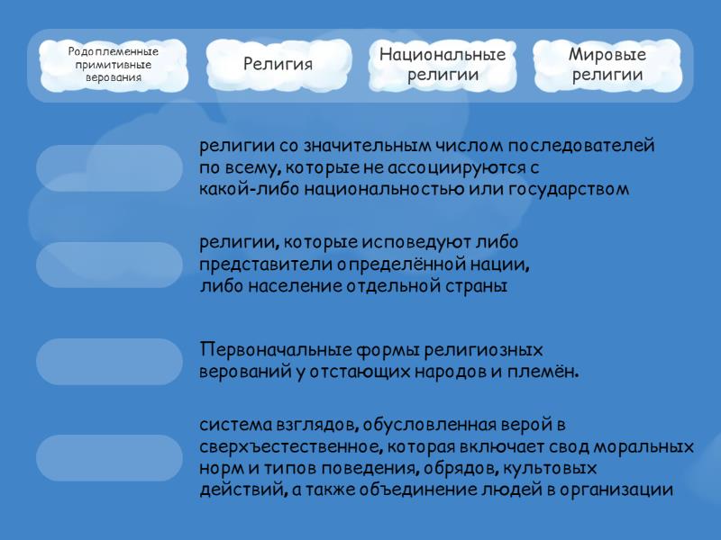 Религия - система взглядов, обусловленная верой в сверхъестественное, которая включает свод моральных норм и типов поведения, обрядов, культовых действий, а также объединение людей в организации, Мировые религии - религии со значительным числом последователей по всему, которые не ассоциируются с какой-либо национальностью или государством, Национальные религии - религии, которые исповедуют либо представители определённой нации, либо население отдельной страны, Родоплеменные примитивные верования - Первоначальные формы религиозных верований у отстающих народов и племён.,