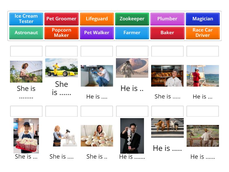 Lifeguard - He is ..., Farmer - She is ........, Race Car Driver - She is ......, Baker - She is ....., Plumber - He is ...., Astronaut - He is .., Pet Groomer - She is ...., Popcorn Maker - She is ..., Pet Walker - He is ....., Zookeeper - He is ......, Magician - He is ......., Ice Cream Tester - She is ..,
