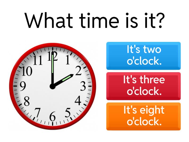 1) What time is it? a) It's two o'clock. b) It's three o'clock. c) It's eight o'clock. 2) What time is it? a) It's ten o'clock. b) It's half past ten. 3) What time is it? a) It's three o'clock. b) It's eleven o'clock. c) It's eight o'clock. 4) What time is it? a) It's seven o'clock. b) It's half past seven. c) It's o'clock. 5) What time is it? a) It's one o'clock. b) It's twelve o'clock c) It's half past twelve. 6) What time is it? a) It's half past six. b) It's six o'clock. 7) What time is it? a) It's nine o'clock b) It's half past nine. 8) It's half past eleven. a) b) c) 9) It's four o'clock. a) b) c)