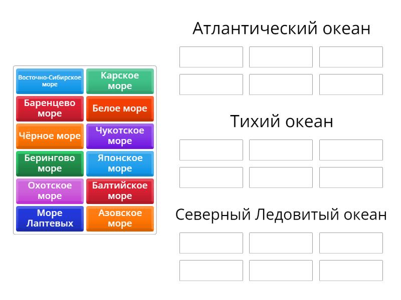 Атлантический океан: Чёрное море, Азовское море, Балтийское море, Тихий океан: Охотское море, Японское море, Берингово море, Северный Ледовитый океан: Море Лаптевых, Карское море, Баренцево море, Белое море, Восточно-Сибирское море, Чукотское море,