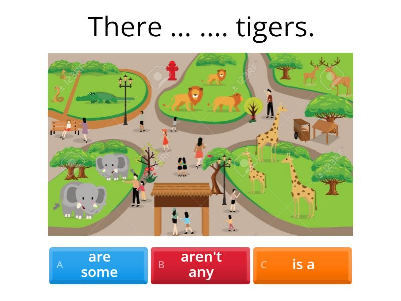 1) There ... .... tigers. a) are some b) aren't any c) is a 2) There ... ... crocodile. a) are some b) aren't any c) is a 3) There ... ... elephants. a) are some b) aren't any c) is a 4) There ... ... bears. a) are some b) aren't any c) is a 5) There ... ... snakes. a) are some b) aren't any c) is a 6) There ... ... giraffes. a) are some b) aren't any c) is a 7) There ... ... wolves. a) are some b) aren't any c) is a 8) There ... ... kangaroos. a) are some b) aren't any c) is a 9) There ... ... lions. a) are some b) aren't any c) is a
