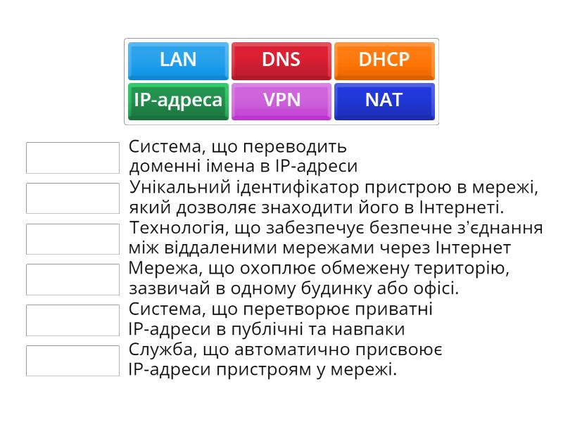 IP-адреса - Унікальний ідентифікатор пристрою в мережі, який дозволяє знаходити його в Інтернеті., DHCP - Служба, що автоматично присвоює IP-адреси пристроям у мережі., DNS - Система, що переводить доменні імена в IP-адреси, NAT - Система, що перетворює приватні IP-адреси в публічні та навпаки, VPN - Технологія, що забезпечує безпечне з’єднання між віддаленими мережами через Інтернет, LAN - Мережа, що охоплює обмежену територію, зазвичай в одному будинку або офісі.,