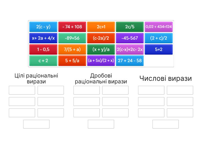 Цілі раціональні вирази: 2c+1, 2(c - у), (2 + c)/2, c + 2, (c-2а)/2, 2c/5, 2(c-x)+2c- 2x, Дробові раціональні вирази: (х + у)/а, 7/(5 + а), 5 + 5/а, (а + 5х)/(2 + х), х+ 2а + 4/х, Числові вирази: 5+2, 27 + 24 - 58, 1 - 0,5, 0,02 + 434+124, - 74 + 108, -45-567, -89+56,