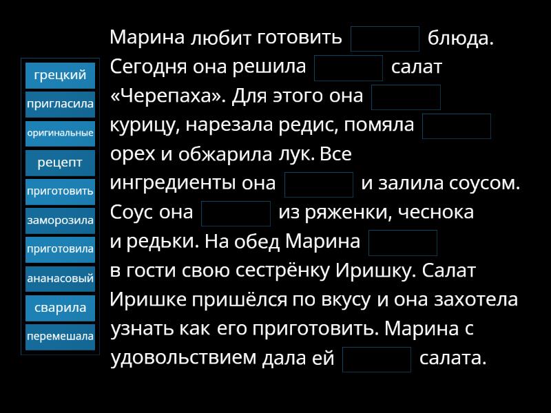 Марина любит готовить ____ блюда. Сегодня она решила ____ салат «Черепаха». Для этого она ____ курицу, нарезала редис, помяла ____ орех и обжарила лук. Все ингредиенты она ____ и залила соусом. Соус она ____ из ряженки, чеснока и редьки. На обед Марина ____ в гости свою сестрёнку Иришку. Салат Иришке пришёлся по вкусу и она захотела узнать как его приготовить. Марина с удовольствием дала ей ____ салата.