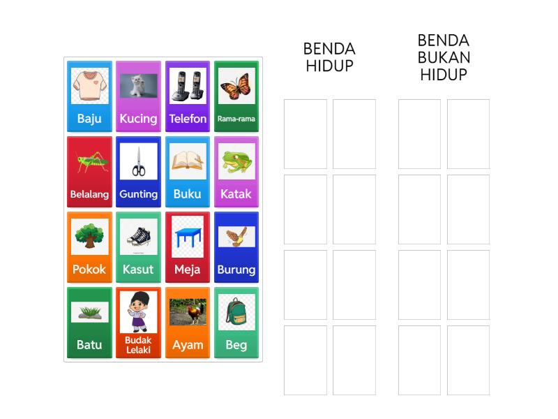 BENDA HIDUP: Burung, Budak Lelaki, Belalang, Pokok, Katak , Kucing, Rama-rama, Ayam, BENDA BUKAN HIDUP: Beg, Meja, Telefon, Baju, Buku, Gunting, Kasut , Batu,