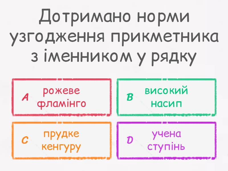 1) Дотримано норми узгодження прикметника з іменником у рядку a) рожеве фламінго b) високий насип c) прудке кенгуру d) учена ступінь 2) Помилку в написанні прикметникового суфікса допущено в рядку a) вишневий, замшевий b) тіньовий, почуттєвий c) гайовий, алюмінійовий d) плюшевий, палацовий 3) НЕПРАВИЛЬНО утворено форму наказового способу дієслова в рядку a) живімо, стіймо b) сядемо, повірмо c) дихаймо, граймо d) бережімо, печімо 4) Правильні особові форми дієслів наведено в рядку a) боряться, орють b) полять, сміються c) працюють, клеють d) сидять, носять 5) НЕПРАВИЛЬНО утворено форму дієприкметника в рядку a) продуманий детально b) одягнувший вишиванку c) виготовлений із глини d) посаджений у затінку 6) Правильно утворено форму третьої особи множини від інфінітива a) гоїти – гоють b) хотіти – хотять c) кричати – кричать d) молоти – мелять 7) Закінчення -ю у формі орудного відмінка однини треба писати в усіх іменниках рядка a) ваніль, розкіш, мігрень b) вісь, подорож, накип c) радість, емаль, нежить d) бандероль, ступінь, путь 8) Помилку в написанні особових закінчень дієслів допущено в рядку a) полють, кричимо b) бачать, булькаємо c) поборють, варимо d) скачуть, шепочимо 9) У формі наказового способу наведено всі дієслова, ОКРІМ a) проси b) даси c) пиши d) чеши 10) Позначте рядок, у якому всі іменники належать до жіночого роду: a) вуаль, Чилі, акварель, Міссісіпі b) бязь, СДПУ, Токіо, юнь c) сутінь, путь, степ, галузь d) загс, ГЕС, жовч, пастораль