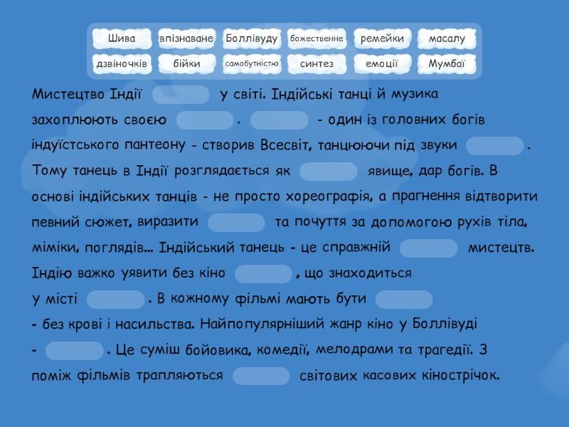 Мистецтво Індії ____ у світі. Індійські танці й музика захоплюють своєю ____. ____ - один із головних богів індуїстського пантеону - створив Всесвіт, танцюючи під звуки ____. Тому танець в Індії розглядається як ____ явище, дар богів. В основі індійських танців - не просто хореографія, а прагнення відтворити певний сюжет, виразити ____ та почуття за допомогою рухів тіла, міміки, поглядів... Індійський танець - це справжній ____ мистецтв. Індію важко уявити без кіно ____, що знаходиться у місті ____. В кожному фільмі мають бути ____ - без крові і насильства. Найпопулярніший жанр кіно у Боллівуді - ____. Це суміш бойовика, комедії, мелодрами та трагедії. З поміж фільмів трапляються ____ світових касових кінострічок.