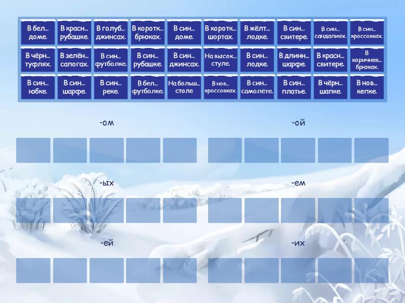-ом: В красн... свитере., В бел... доме., На высок... стуле., На больш... столе, В длинн... шарфе., -ой: В нов... кепке., В бел... футболке., В чёрн... шапке., В красн... рубашке., В жёлт... лодке., -ых: В зелён... сапогах., В голуб... джинсах., В коричнев... брюках., В нов... кроссовках., В чёрн... туфлях., -ем: В син... доме., В син... шарфе., В син... платье., В син... свитере., В син... самолёте., -ей: В син... реке., В син... рубашке., В син... лодке., В син... юбке., В син... футболке., -их: В коротк... шортах., В син... джинсах., В син... сандалиях., В коротк... брюках., В син... кроссовках.,