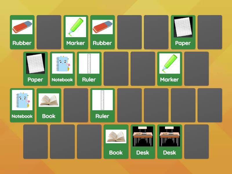 Book, Notebook, Rubber, Marker, Ruler, Paper, Desk, Pen, School bag, Dictionary, Pencil, Chair, Door, Window, Laptop,