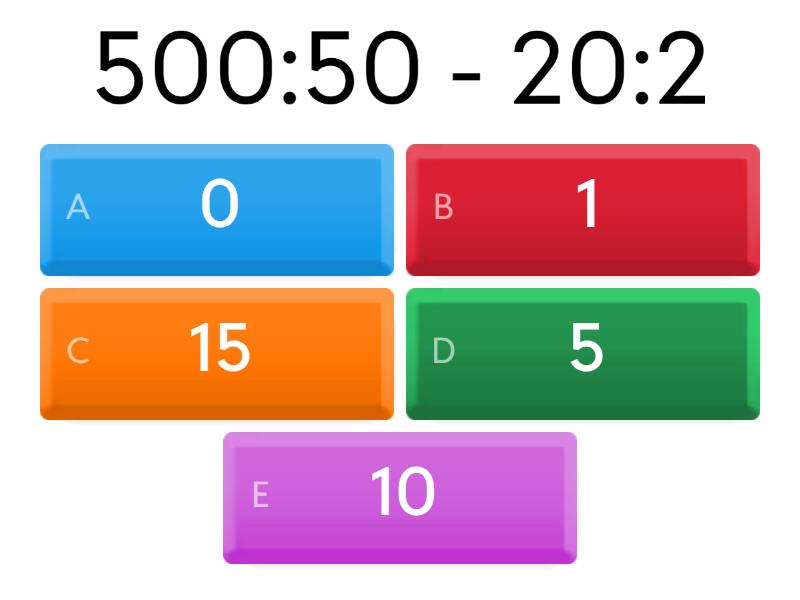 1) 500:50 - 20:2 a) 0 b) 1 c) 15 d) 5 e) 10 2) 800:400 + 200:2 a) 102 b) 400 c) 120 d) 124 e) 300 3) 900 : (500-200) a) 2 b) 3 c) 6 d) 8 e) 9 f) 30 4) 250:5 + 300:300 a) 50 b) 52 c) 51 d) 6 5) 800 - 300:5 a) 700 b) 740 c) 760 d) 200