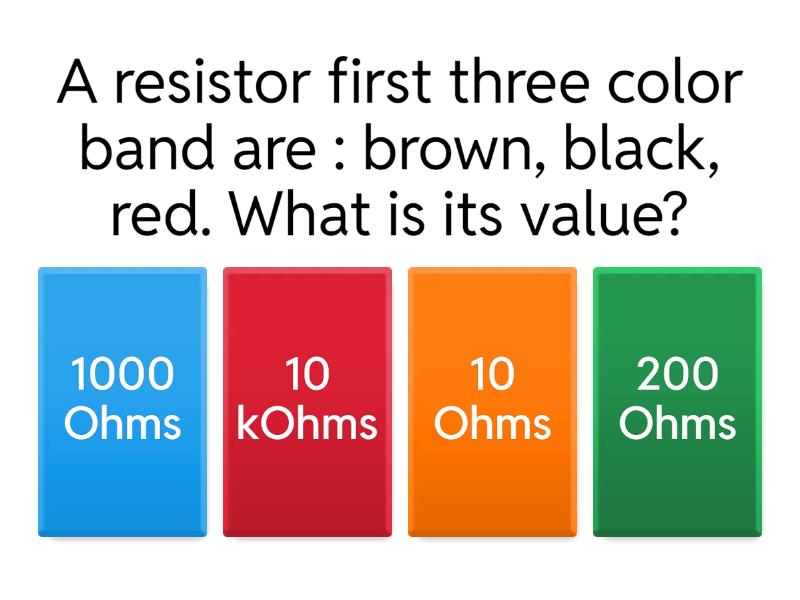 1) A resistor first three color band are : brown, black, red. What is its value? a) 1000 Ohms b) 10 kOhms c) 10 Ohms d) 200 Ohms 2) What digit does the color yellow denote on a resistor color band? a) 4 b) 7 c) 2 d) 0 3) A 47 kOhms resistor would have which color on its first 3 band? a) Yellow, Violet, Orange b) Red, White, Blue c) Yellow, Violet, Red d) Orange, Yellow, Violet 4) What digit does the color ORANGE denote on a resistor color band? a) 3 b) 5 c) 0 d) 2 5) Give one main type of electrical accident a) electrical bur b) electrical grounding c) electrical flow d) electrical current 6) What is the symbol for the quantity of "Length" a) m b) km c) kg d) s 7) What is the multiplier factor for the prefix name 'micro' a) 10-6 b) 106 c) 10-9 d) 10-3 8) What tools need to be used to measure the quatities of 'Resistance' a) Ohmmeter b) Voltmeter c) Ammeter d) Resistometer