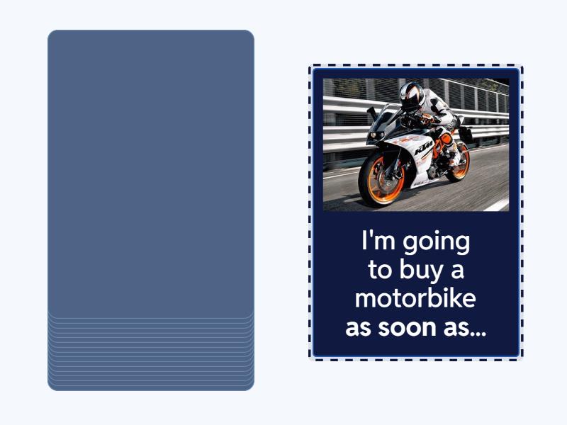 As soon as we've arrived at the hotel..., Carry on taking the antibiotics until..., What are you going to do when...?, Don't disturb the boss unless..., I'll give you a call after..., I'll do the washing up if..., I'm going to buy a motorbike as soon as..., I'm sure your friend will understand if..., We'll be having a barbecue tomorrow unless..., Shh! Don't make a noise in case..., Unless you hurry up..., If his wife tells him what to do,..., We must say goodbye to Louise before..., We need to book the holiday soon in case..., If you're not feeling better tomorrow..., You may get an electric shock if..., I won't be able to start cooking dinner until....